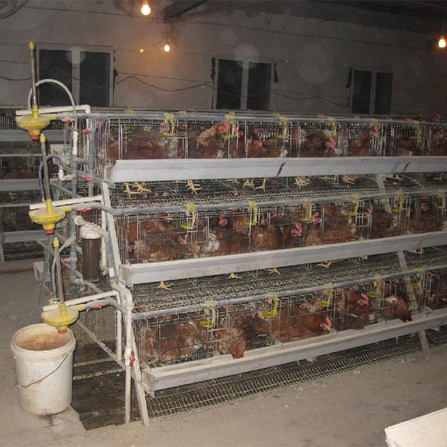 3、蛋鸡笼:每个单笼长40厘米,深45厘米,前高45厘米,后高38厘米,笼底坡度为6°~8°。伸出笼外的集蛋槽为12~16厘米。笼门前开,宽21~24厘米;高40厘米,下缘距底网留出4.5厘米左右的滚蛋空隙。笼底网孔径间距2.2厘米,纬间距6厘米。顶、侧、后网的孔径范围变化较大,一般网孔经间距10~20厘米,纬间距2.5~3厘米,每个单笼可养3~4只鸡,组合形式常见的有阶梯式、半阶梯式和重叠式。